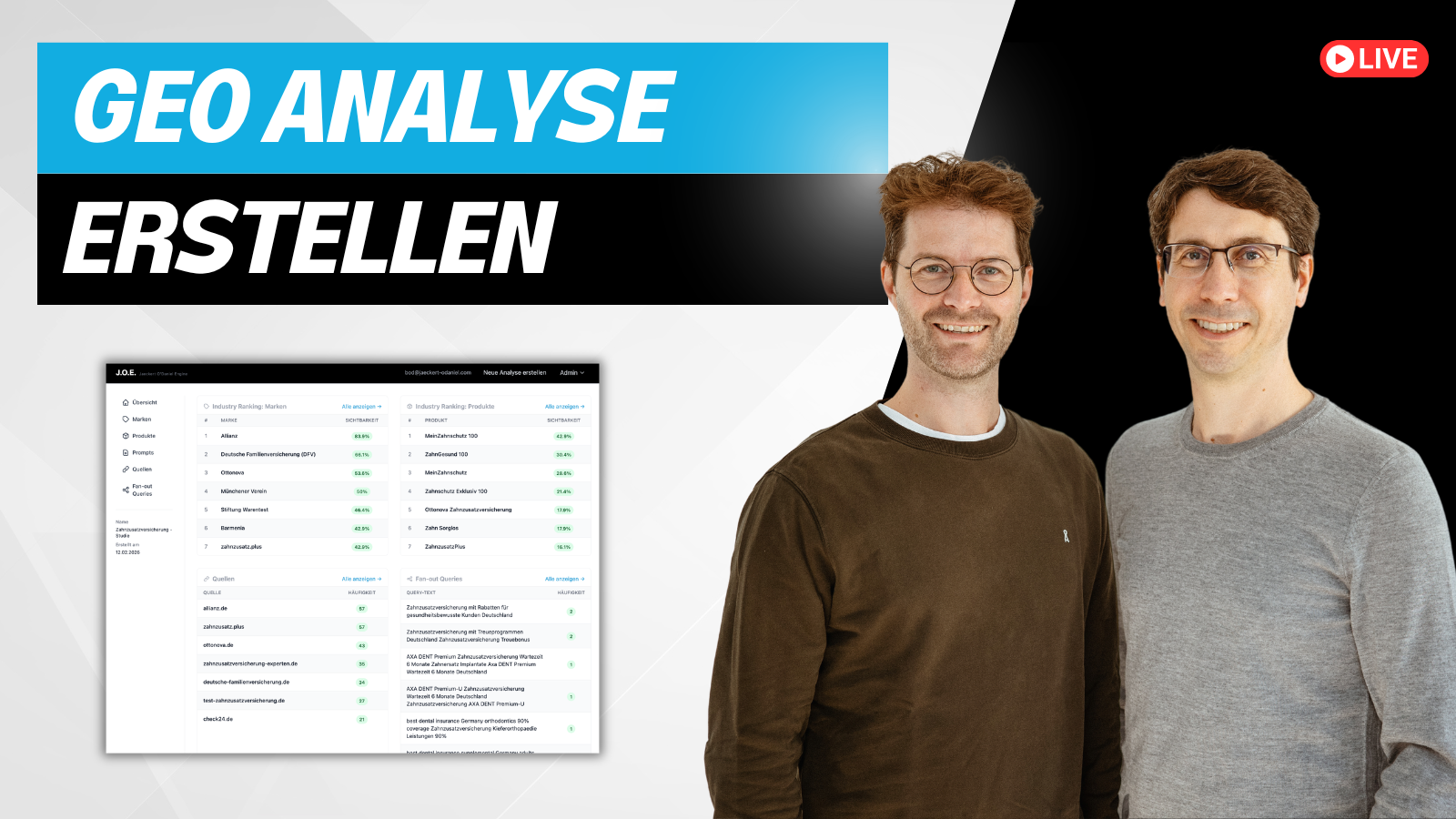 Wie stärkt ihr eure Sichtbarkeit in KI-Systemen? Genau das lernt ihr in unserer GEO Academy. Du erhältst AI Analyse Tools und Weiterbildung aus einer Hand. Wir zeigen dir Strategien und Maßnahmen anhand von Beispielen aus der Praxis. Für mehr Relevanz, Leads, Sales und neue Skills in einer KI-getriebenen Welt. Mehr Infos.