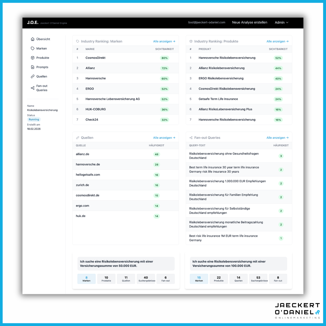 Unser Tool heißt J.O.E. – gesprochen wie der englische Vorname Joe und eine Abkürzung für Jaeckert O’Daniel Engine. Du kannst es nutzen, wenn du in unserer Academy bist mit drei Mal 25 Prompts pro Monat. In J.O.E. siehst du Brand Mentions, Product Mentions, Quellen, Fan out Queries. Gleichzeitig erklären wir in unserer Academy in Live-Workshops, wie du damit arbeitest und eure KI-Sichtbarkeit analysierst und optimierst.