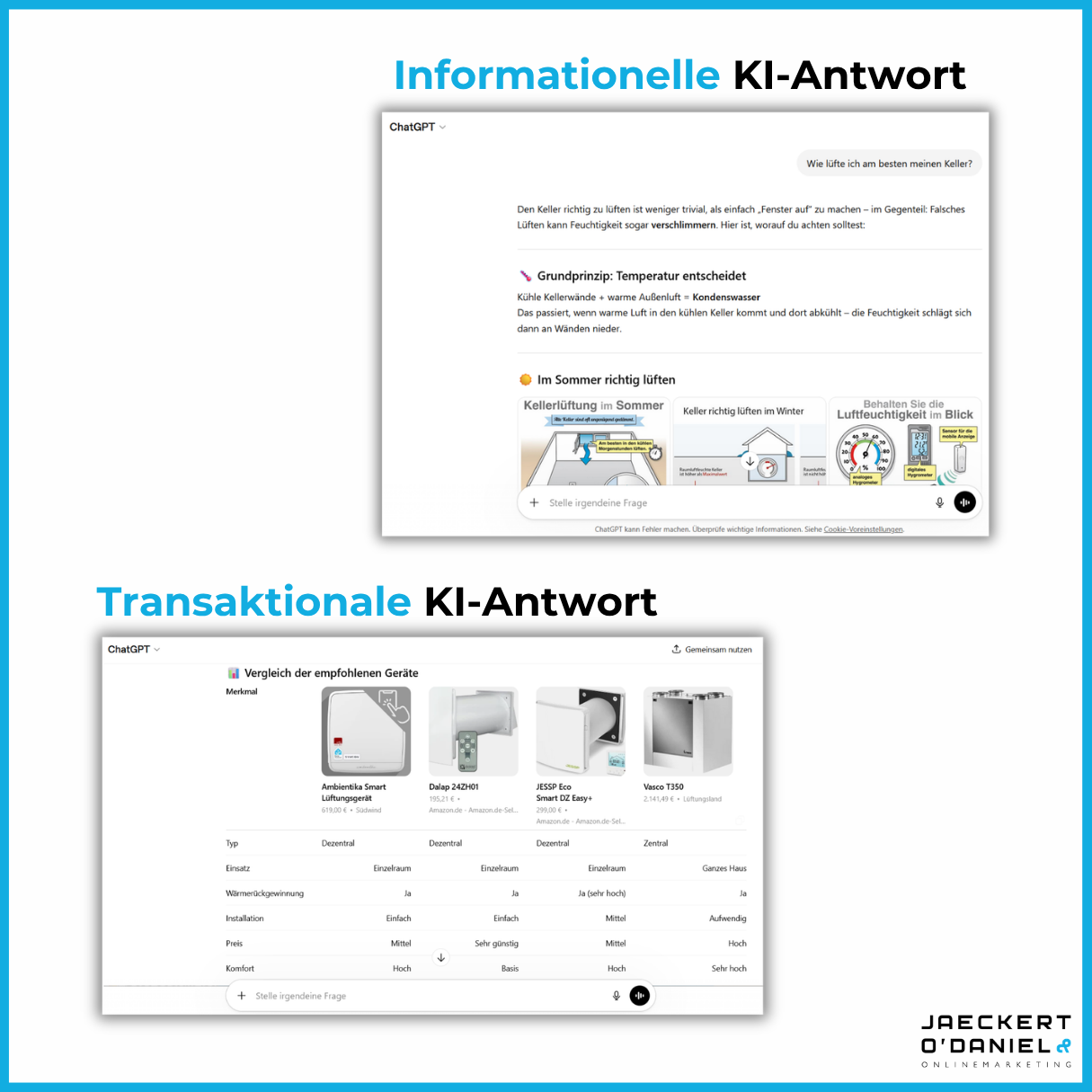 It is completely different with transactional prompts, such as our example “I am looking for a ventilation system”. Here, the entire structure is completely different. Brands and sources are mentioned. Clear favorites are named and a comparison table of products is generated. Prices are shown, shops are linked, and reviews are displayed. Manufacturers of such systems should aim to appear in these AI responses.