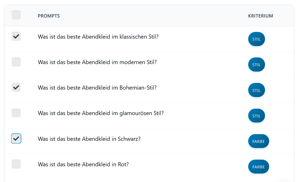 You can use the prompts to set up meaningful monitoring with your AI Visibility Tool. For example, to obtain an industry ranking for your sector. Or to find out for which criterion you still have low AI visibility, in order to optimize specifically there.