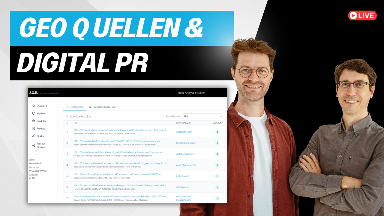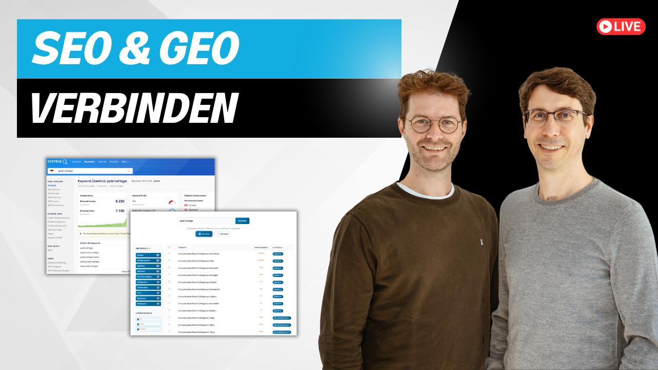 SEO und GEO haben viele Gemeinsamkeiten. Wie kannst du eine Brücke schlagen? Das zeigen wir dir in diesem Workshop. Wir analysieren live eine (evtl. mehrere) Websites. Keywords, Website-Struktur, Rankings & Traffic. Und dann die Erweiterung hin zu KI-Sichtbarkeit: Prompts, Quellen, Brand Mentions & Product Mentions. So kannst du verstehen, wie du alles aus einem Guss umsetzt – und eure Sichtbarkeit doppelt verbesserst.