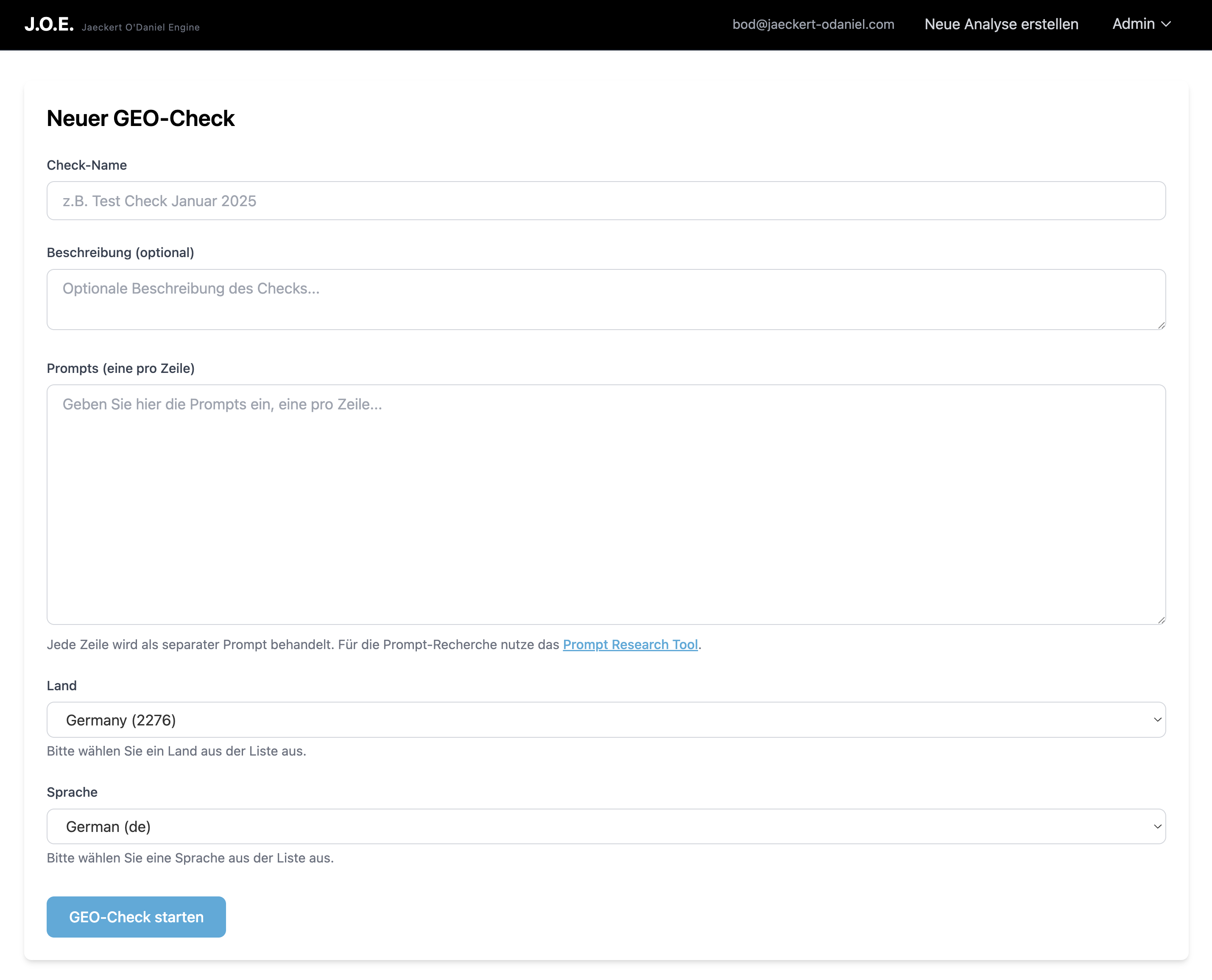 Would you like to work with it too? Then get access to our GEO Academy. All Academy members can also use J.O.E. (3 analyses with 25 prompts each per month). J.O.E. is pronounced like the English first name Joe. It is an abbreviation for “Jaeckert O’Daniel Engine.”
