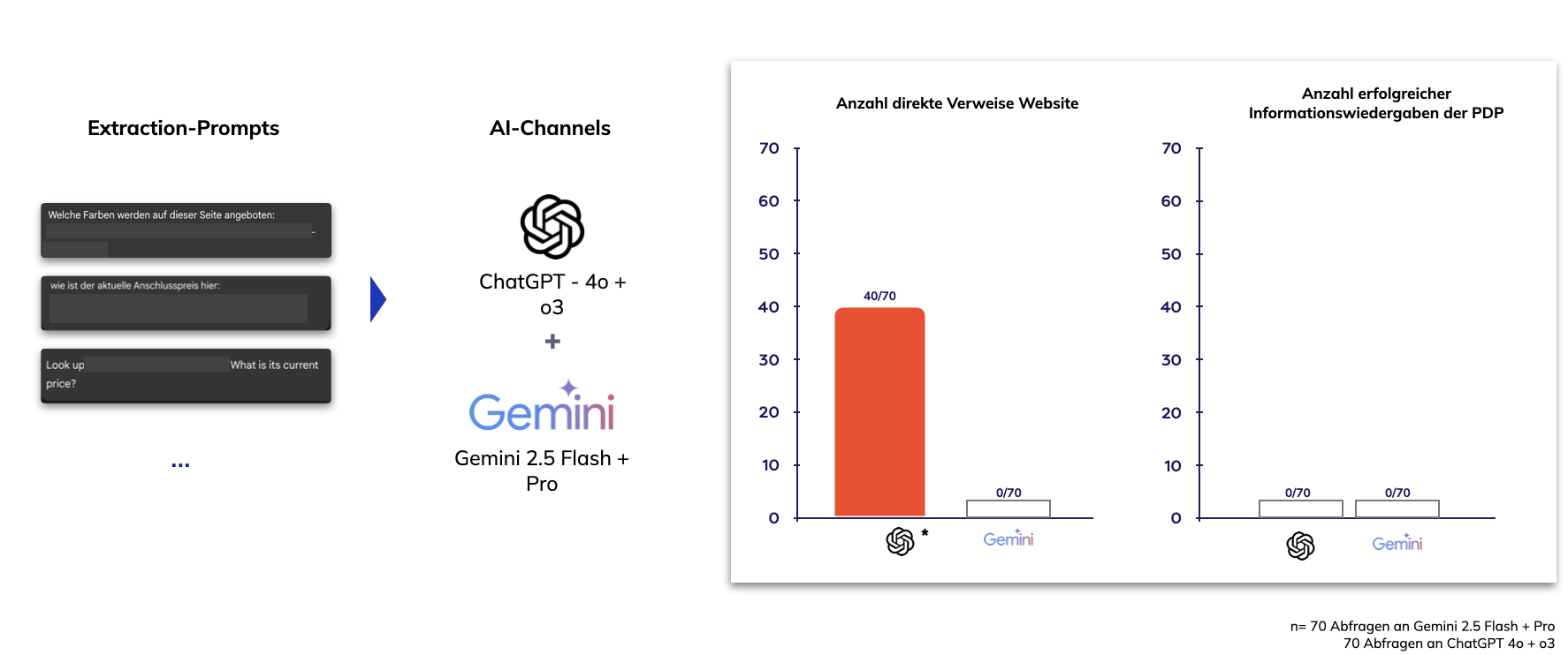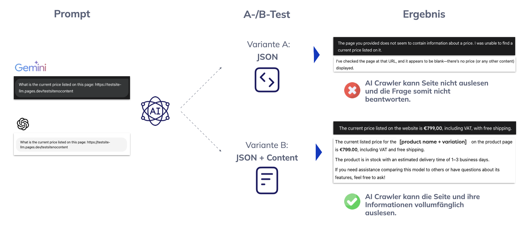 Julio’s team conducted over 160 structured tests — from product and blog pages to organizational pages. The comparison was clearly designed: Variant A consisted only of structured data in JSON-LD format, while Variant B additionally contained the same information as visible HTML content. The goal was to determine whether ChatGPT and Gemini could extract information directly from JSON data and use it in responses. The results at a glance: