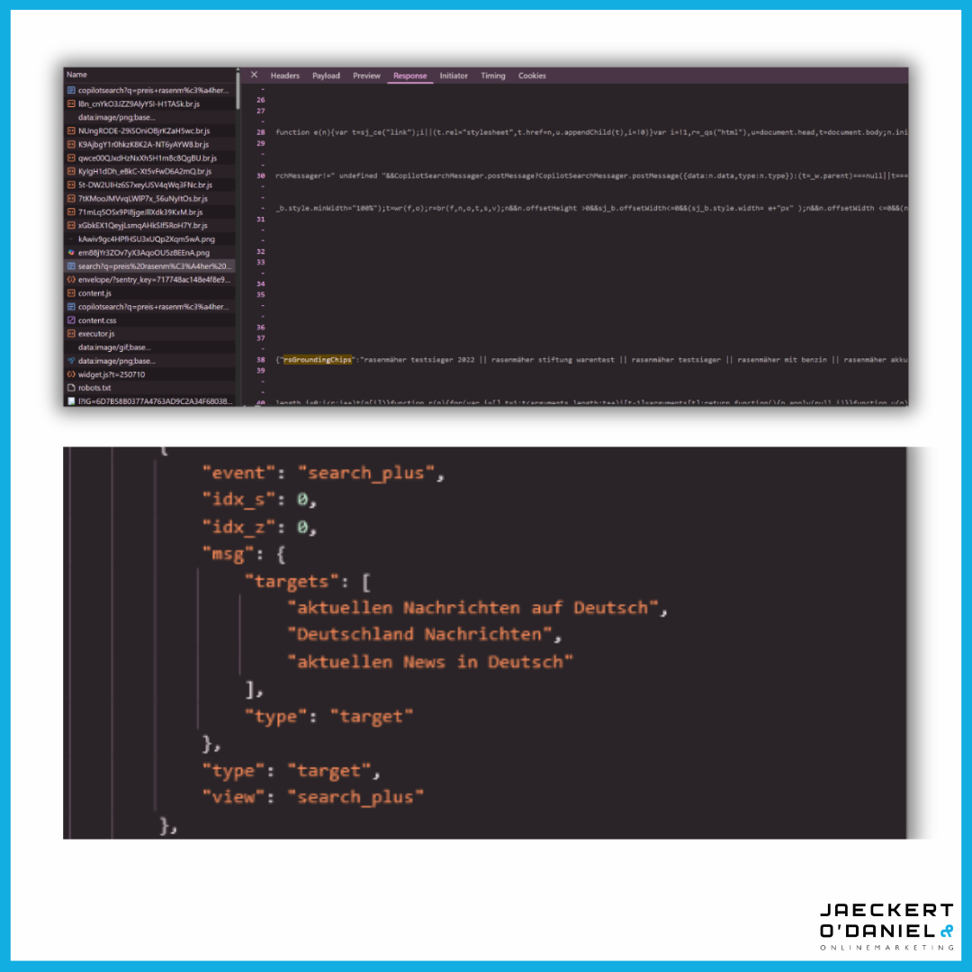 Dafür wird der Prompt in mehrere Suchanfragen umgewandelt, also bestimmte Abfolgen von Keywords. So wie man es als User auch machen würde. Zum Beispiel Test, Vergleich, Kosten, aktuell, 2025, aber auch Kriterien oder lokale Keywords. Anschließend werden Suchmaschinen angesteuert, wie etwa Bing oder Google. Die Suchergebnisse werden ausgewertet. Content von Websites wird genutzt. Wenn noch relevante Informationen fehlen, wird eine weitere Folge von Suchanfragen ausgelöst.